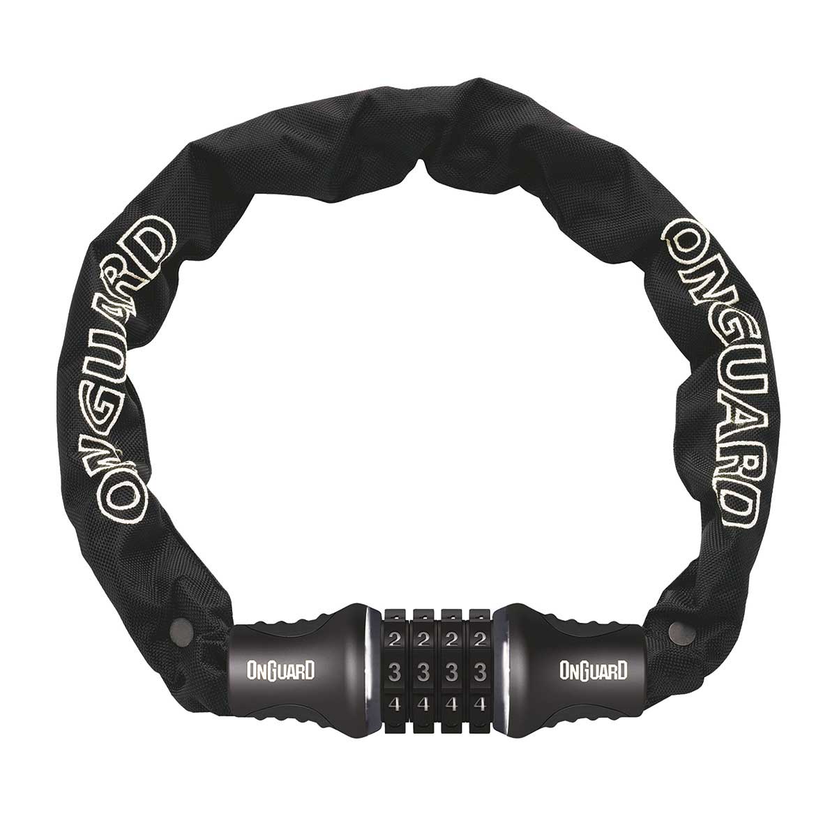Catena Onguard con sistema di chiusura SBC Steel Ball Combo che utilizza 4 ghiere rotanti in acciaio resistenti agli strappi e con 10.000 combinazioni possibili. Rivestimento in tessuto protettivo con logo ricamato ed impugnatura in gomma antiscivolo.