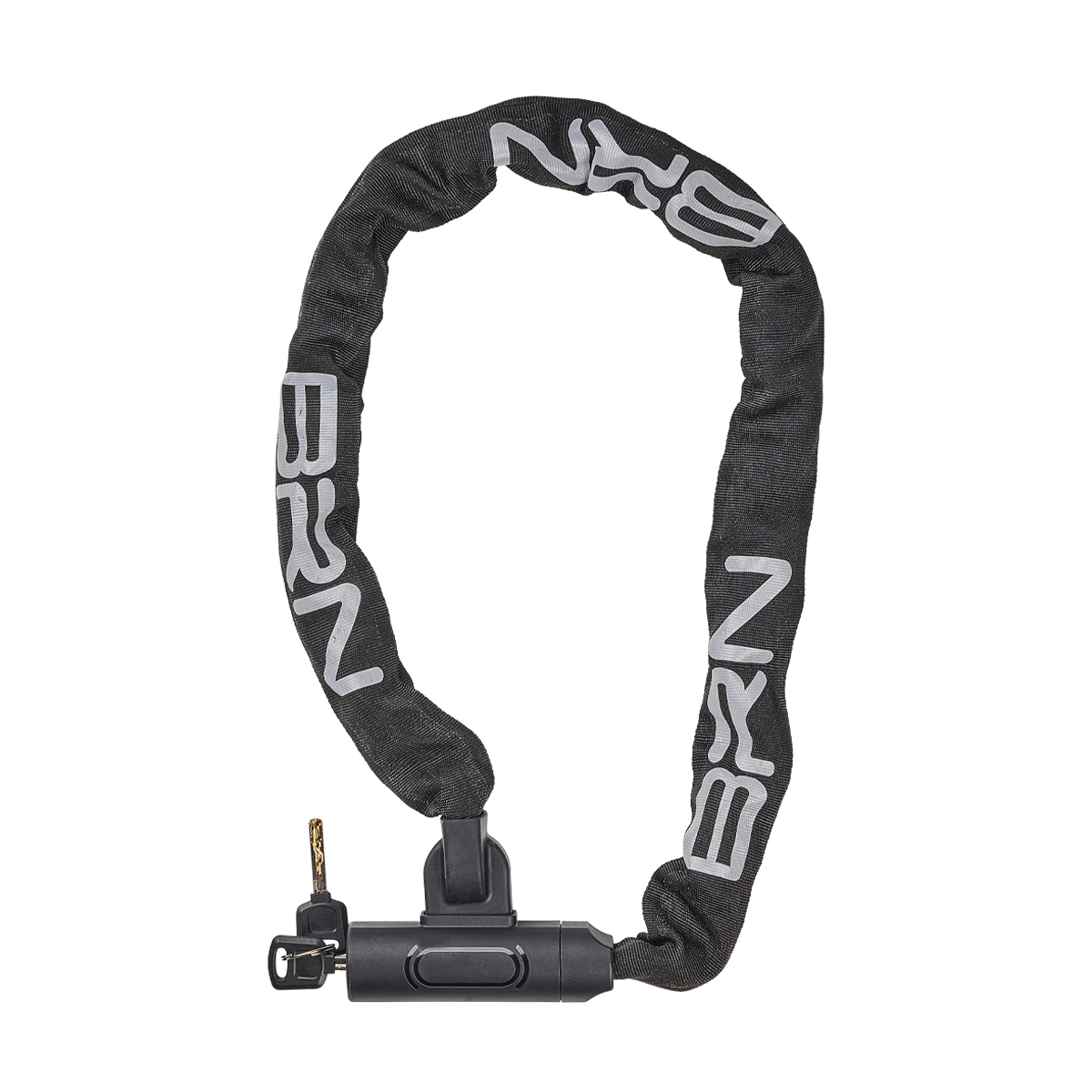Lucchetto BRN a chiave con catena da 100 cm x 8.5 mm a maglia quadra rivestita con un tessuto nero antiurto, antigraffio, resistente al taglio. Su quest'ultimo sono presenti loghi rifrangenti per dare maggiore visibilità al lucchetto durante le ore meno luminose del giorno.