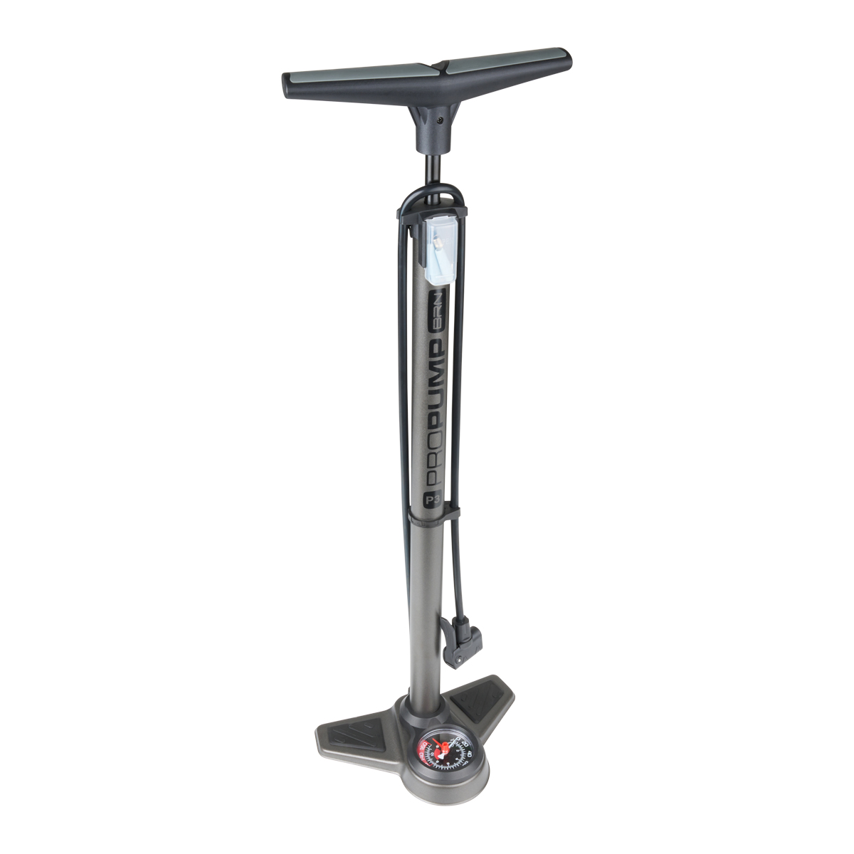 Pompa BRN P3 con pressione fino a 8,5 BAR-120 PSI, alta 72 cm, dotata di manico ergonomico, basamento antiscivolo e manometro da 60 mm.