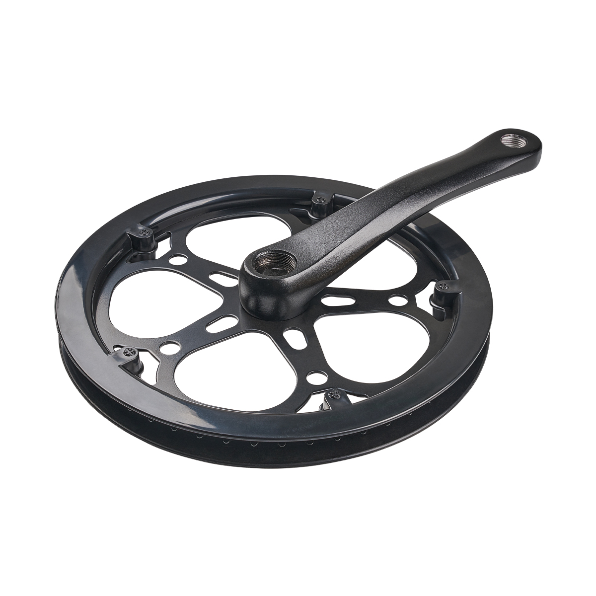 Guarnitura nera modello Fat-Bike da 52 denti con corone in acciaio, doppio paracorona, perno quadro e pedivelle da 165 mm in acciaio.