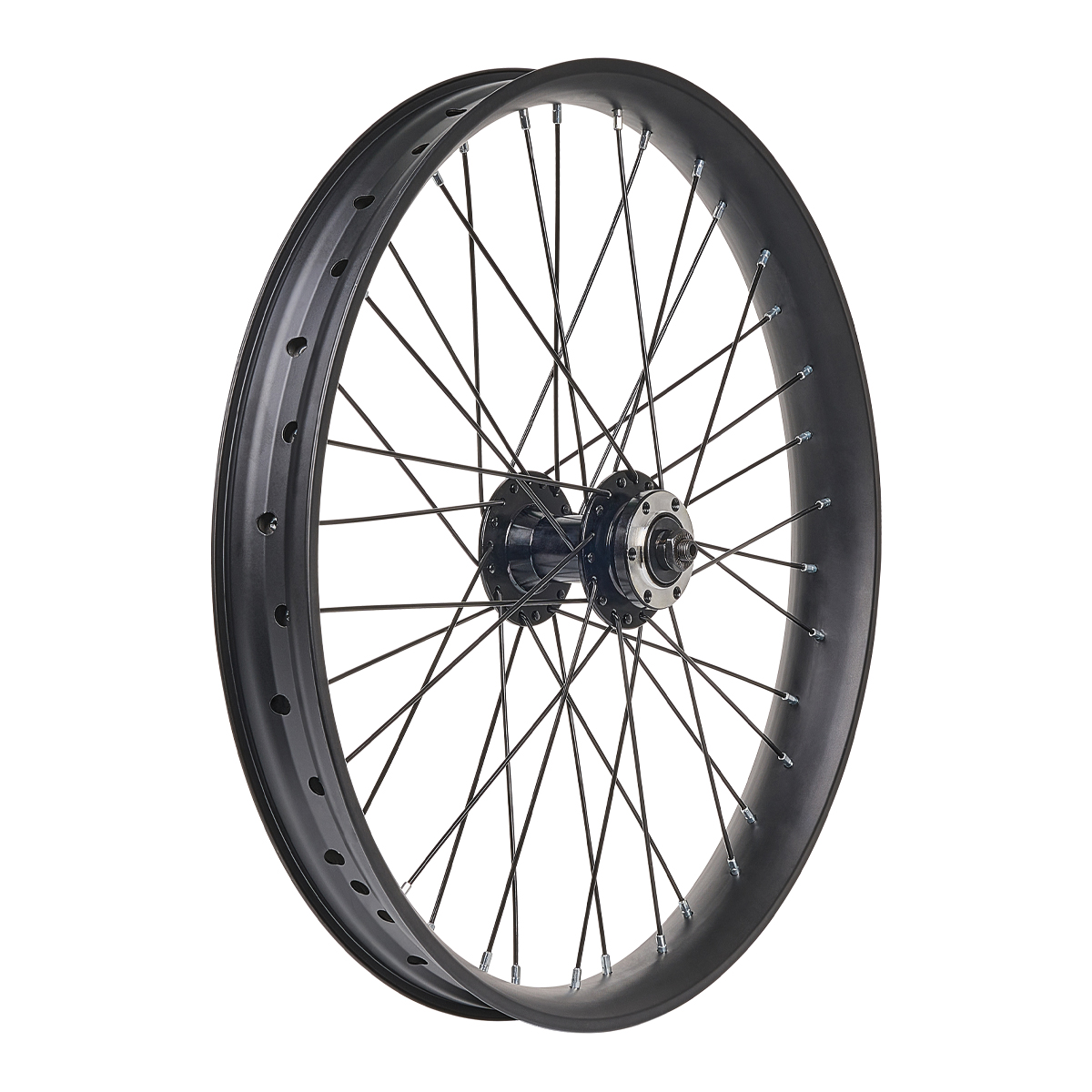Ruota BRN 20" anteriore per Fat-Bike. E' composta da un cerchio in alluminio largo 45 mm e da un mozzo a disco in alluminio su sfere con bloccaggio e 36 raggi.