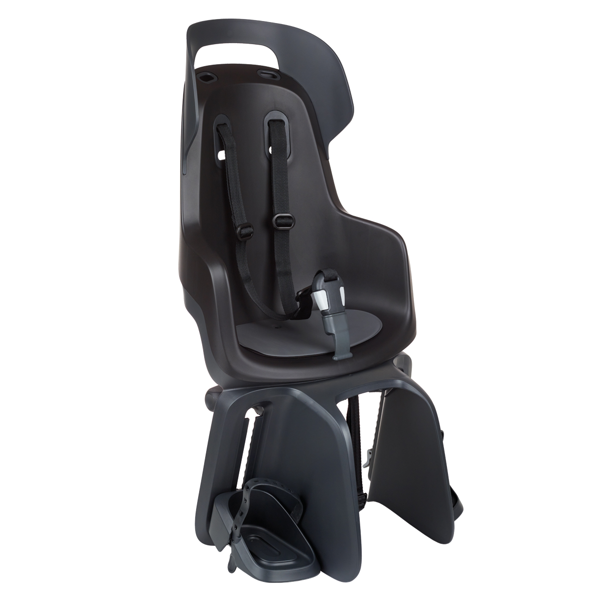 Seggiolino Bobike Go nero posteriore con attacco al portapacco.