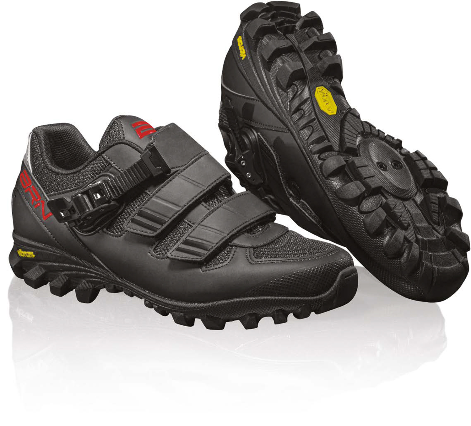 Le scarpe Freeride BRN sono progettate per rendere il massimo su tutti i terreni! La scelta della suola Vibram®, un’eccellenza italiana che è da sempre un riferimento nella realizzazione di calzature da montagna, rappresenta il giusto compromesso tra rigidità - che migliora l’efficienza durante la pedalata - e comfort nei tratti che si percorrono a piedi. Lo speciale compound della suola conferisce una particolare resistenza all’abrasione, un’ottima capacità di assorbimento degli urti e un grip eccellente su superfici asciutte e bagnate anche grazie ai tacchetti laterali che danno stabilità sui terreni rocciosi, mentre la tomaia in pelle sintetica, leggera e resistente all’acqua, con due strappi ed un cricchetto, asseconda al meglio le forme del piede per conferire il massimo comfort.